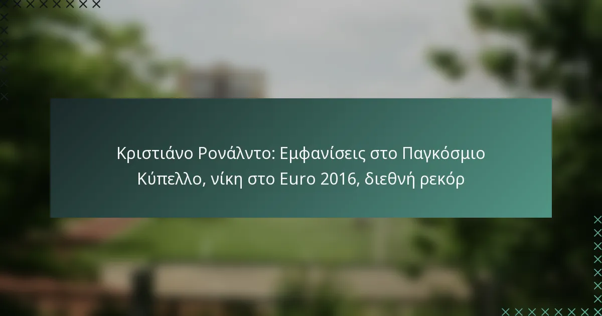 Ο Κριστιάνο Ρονάλντο έχει αφήσει ανεξίτηλο σημάδι στο διεθνές ποδόσφαιρο, ιδιαίτερα μέσω των εξαιρετικών του εμφανίσεων στο Παγκόσμιο Κύπελλο FIFA και του καθοριστικού ρόλου του στη νίκη της Πορτογαλίας στο Euro 2016. Γνωστός για τις εξαιρετικές του ικανότητες και την ηγεσία του, έχει συνεισφέρει όχι μόνο κρίσιμους γκολ και ασίστ, αλλά έχει επίσης θέσει πολυάριθμα διεθνή ρεκόρ που υπογραμμίζουν την κληρονομιά του στο άθλημα.