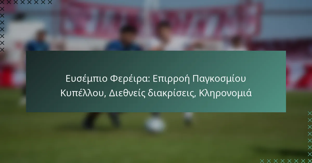 Ο Ευσέμπιο Φερέιρα, μια θρυλική μορφή στο ποδόσφαιρο, έλαβε πολλές διεθνείς διακρίσεις κατά τη διάρκεια της καριέρας του, ιδιαίτερα για τις εμφανίσεις του στο Παγκόσμιο Κύπελλο FIFA και σε άλλεςprestigious διοργανώσεις. Οι συνεισφορές του όχι μόνο ανέβασαν την εθνική του ομάδα αλλά άφησαν και διαρκές αποτύπωμα στο άθλημα παγκοσμίως.